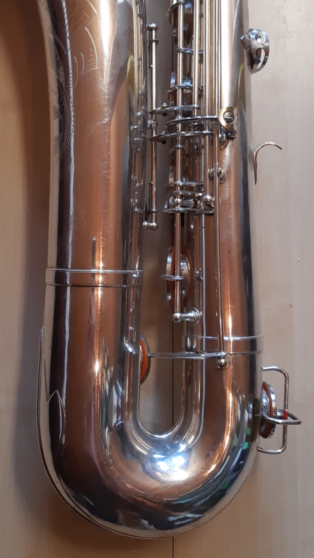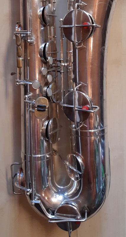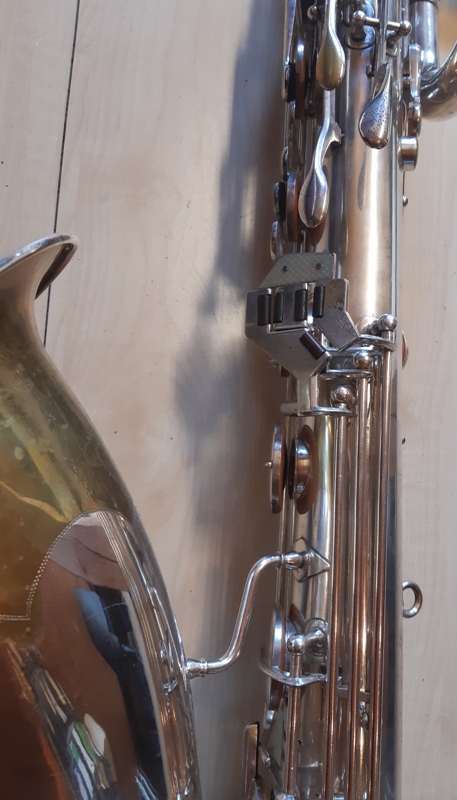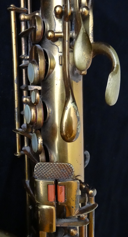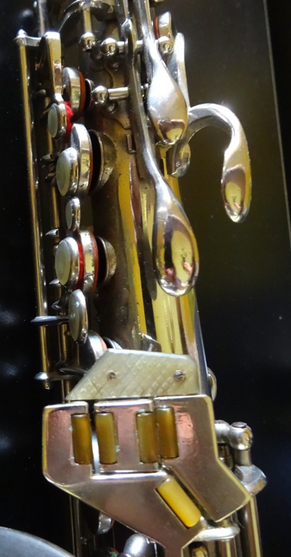 Im Gegensatz zu allen anderen FXH Saxophone die ich bisher gesehen haben ist bei dieses Horn das tiefe C# Klappe vollständig auf die Rechte Seite des Bogenteil verschoben, um Platz für die Stange der Becherklappen Cis, B und H. Wer auf der Vorderseite des Körpers statt der Seite, wie bei modernen Saxophone.