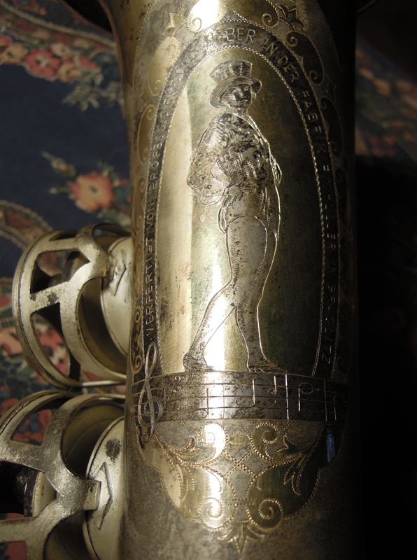 Oben auf dass, es ist speziell graviert ( die nackte Dame, der frühe ersten Periode war für diesen Anlass gekleidet ) und reich verziert, es hat spezielle gestaltete Klappenschutz und Klappen bis zum hohen G. Das muss ein Unikat sein!